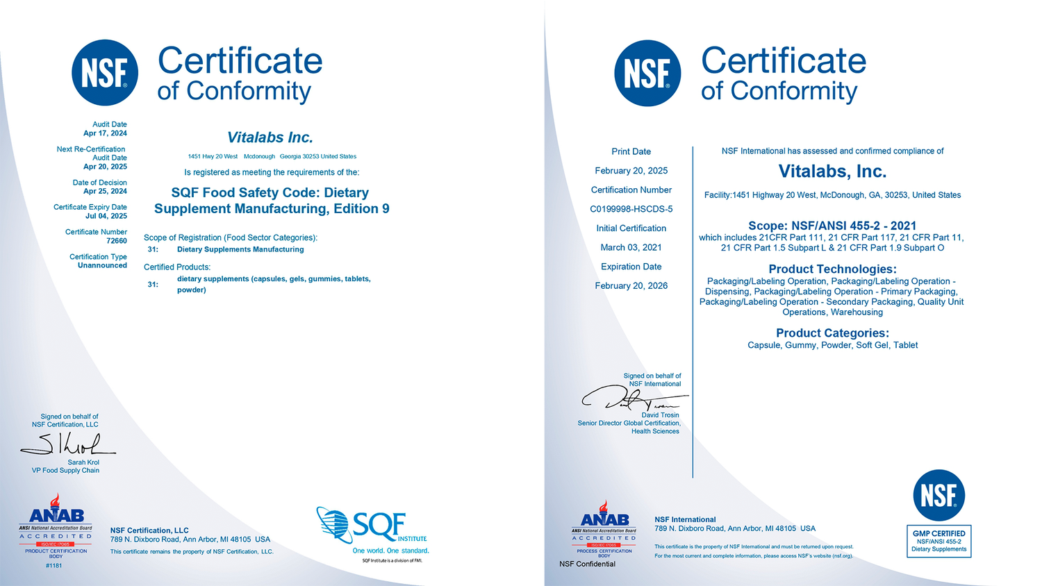 The production facility where our products are manufactured has the following certificates: NSF, FDA Inspected Facility, SQF, USDA ORGANIC, ORGANIC, HALAL, NON GMO, LAB TESTED